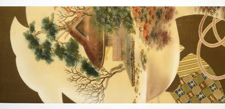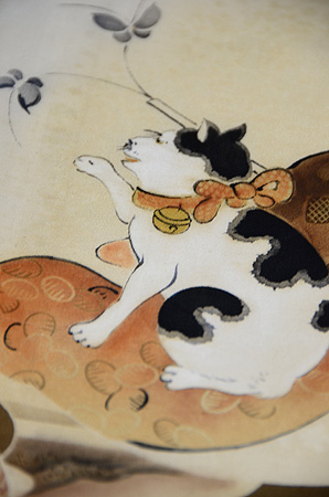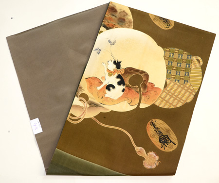 竹内栖鳳の絵を模していますが、技法が珍しく、犬の姿だけビロード織になっています。