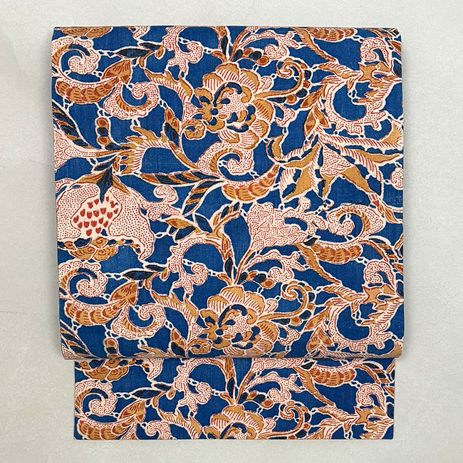 藍に菊ザクロ唐草の和更紗名古屋帯
