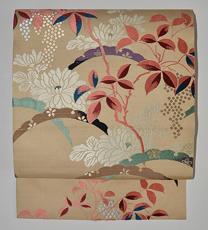 檜垣に葡萄の文様が織り込まれた名古屋帯です。