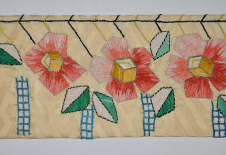 菊の刺繍だけでは重たい感じになるところを市松の優しい色合いが、この帯を楽しいものにしてくれました。
