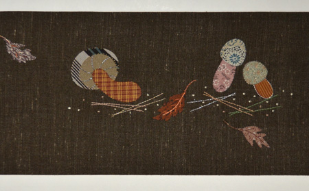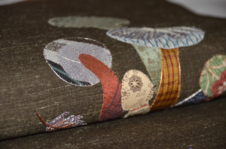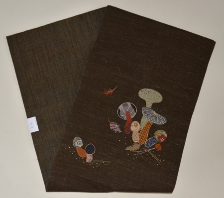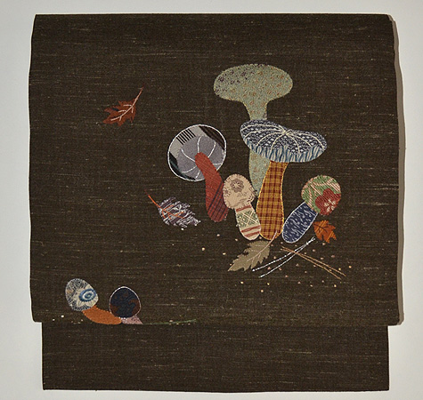 結城縮の地にいろいろな布を用いて、きのこと落葉をコラージュした秋らしい帯です。