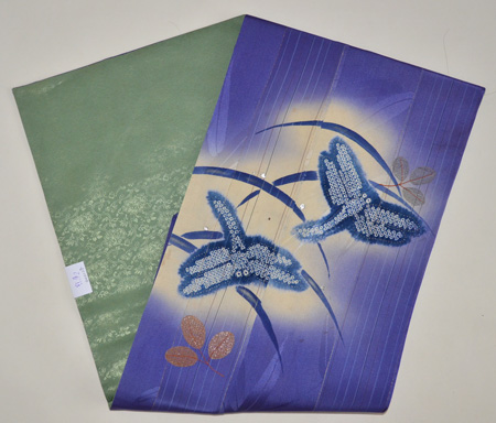 青紫色の地紋入りの絹地にトンボは絞りにより、萩は漆糸の刺繍により表しています。