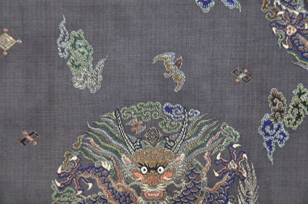 墨色の紗地に朝服を写したと思われる5本つめの龍と宝尽くしが、全面に竹屋町刺繍されています。