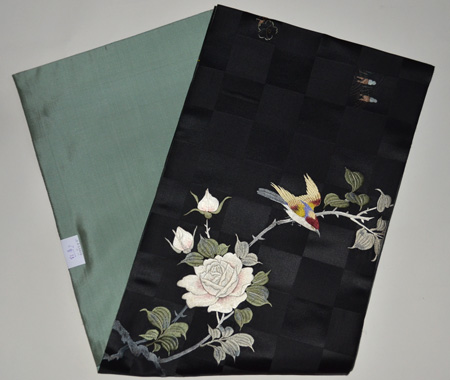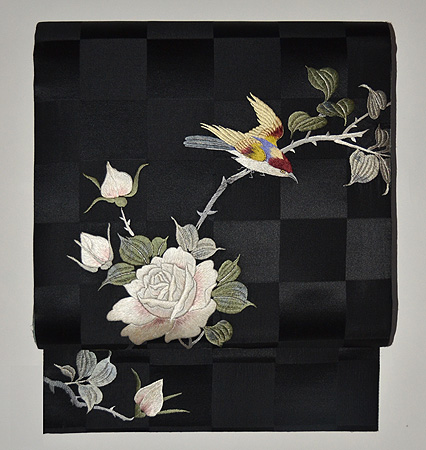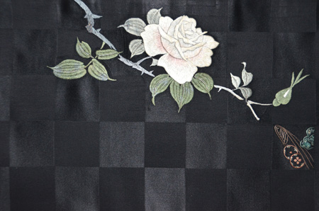 市松の繻子地に野薔薇の刺繍。