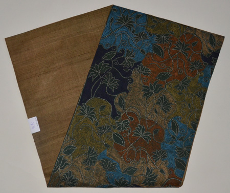 アースカラーの地に配された翡翠のような青色がアクセントになって、神秘的な印象の帯に仕上がっています。