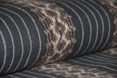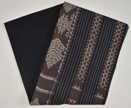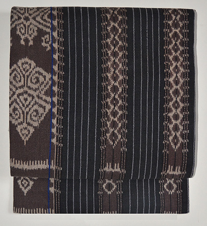 墨黒に経絣のダイナミックな鉤文様がはいり、間に細縞を挟んでいるのですっきりとした印象です。
