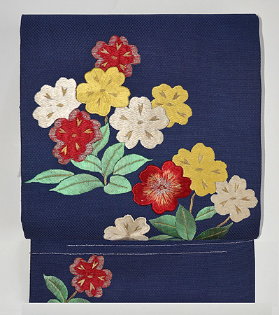 可愛らしい小花柄の生地のコラージュと刺繍が楽しい帯が出来上がりました。