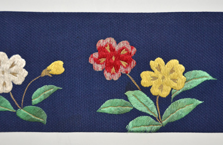 渋めの色合いの織りの生地に刺繍された桜草。