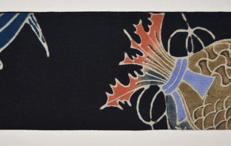 菊丸紋、稲穂に雀、鳴子の図。深まる秋と実りが、表現された型染めです。