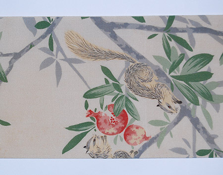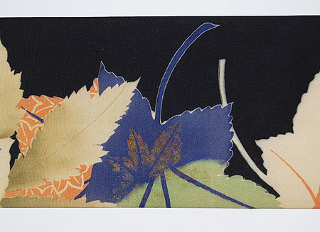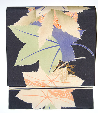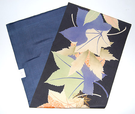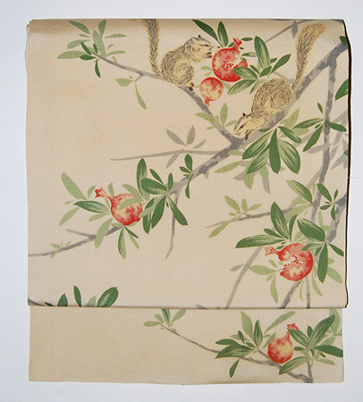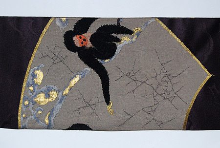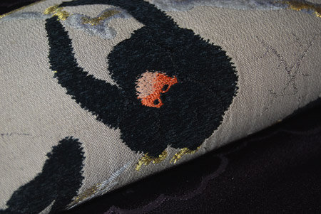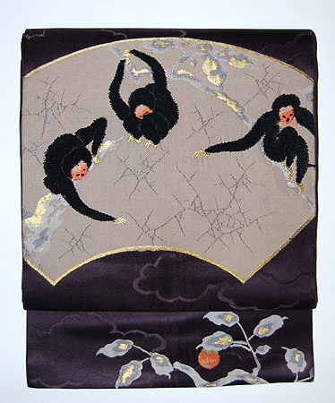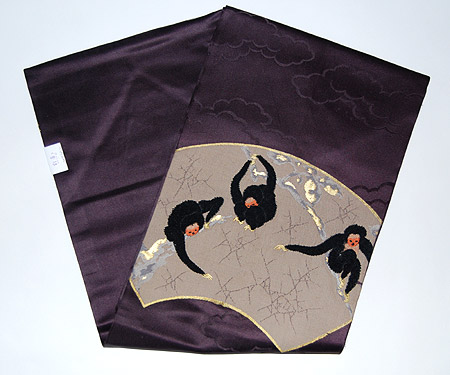 濃紫色の繻子地に扇面の猿の図とたれ下と手先に柿の木が織り出されています。