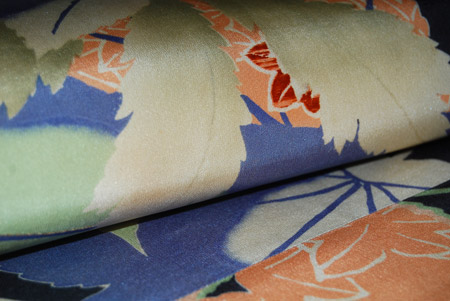 抹茶地の縮緬に菊ともみじを染め、刺繍をほどこしています。