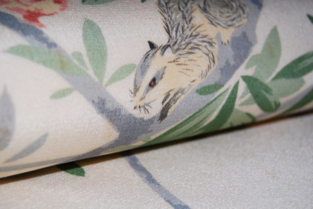紅い地色にパステルカラーで洋花や鳥や蝶が描かれた、心躍るような楽しい帯です。