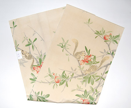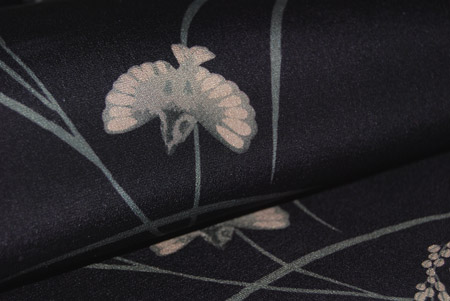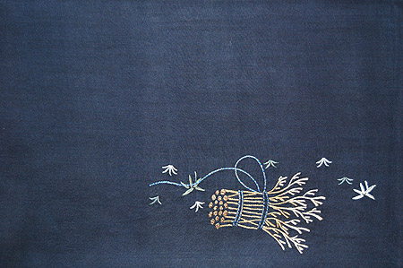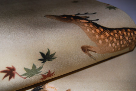 麴塵(きくじん)色の地に、謡曲や源氏物語の本を染め、刺繍をほどこしてあります。