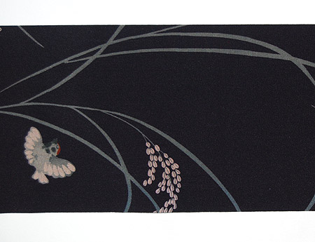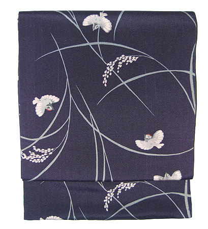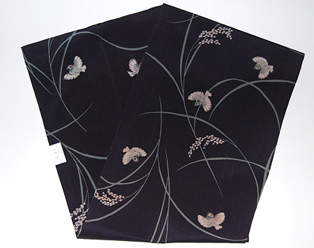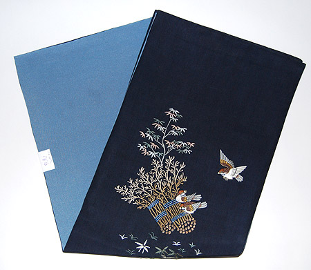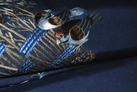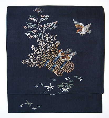 黒塩瀬地に束ね木と雀が刺繍されています。