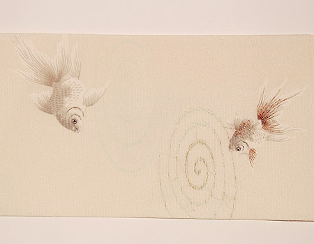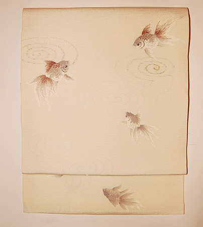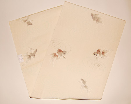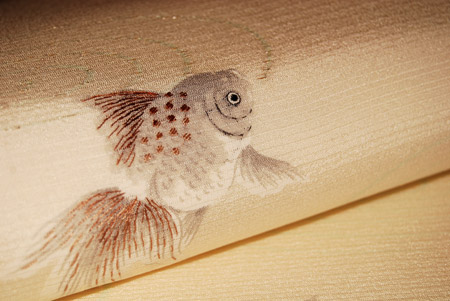 絽の地に水模様と金魚が墨でシックに描かれています。