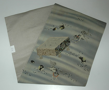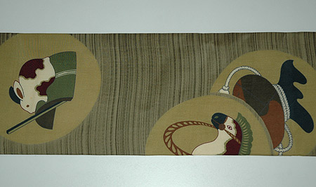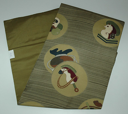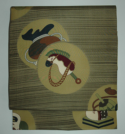 宝珠、春駒、おもちゃなどの図柄が染められた羽二重地の名古屋帯です。