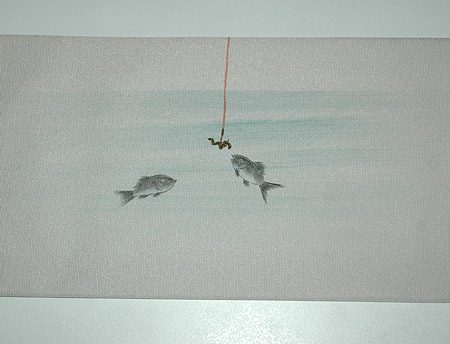 欄干に座った二匹の猫が中睦まじく尻尾から糸を垂らし、魚釣りをしています。