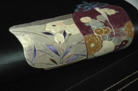 右側には網目状の裂をのせ、冊子は金襴の裂が使われています。