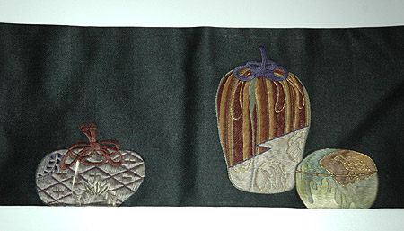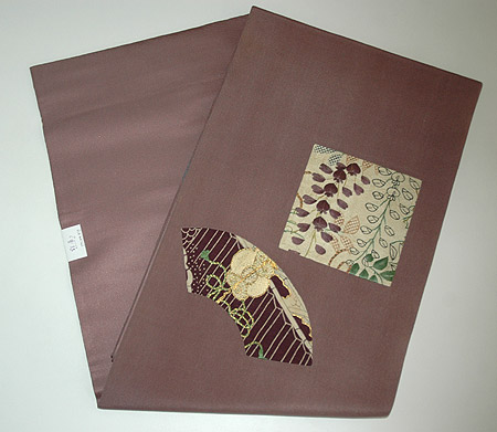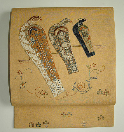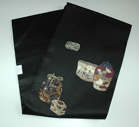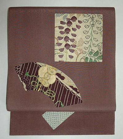 幕末、明治のころの裂地を縮緬地に切り嵌めた格調ある帯です。