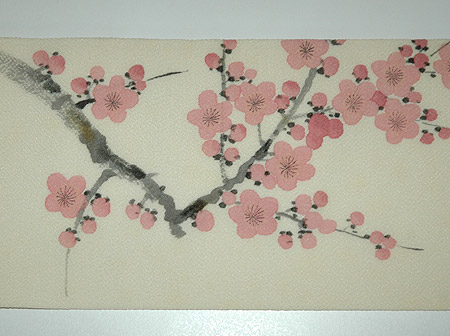 やさしい生成色の縮緬に紅梅が描かれている作家物です。