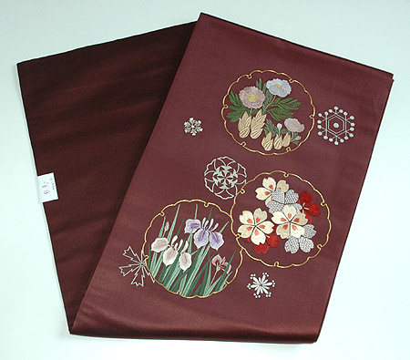 お太鼓部分は雪輪に春の花、前は雪輪に秋花と分けて刺繍してあります。