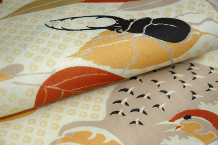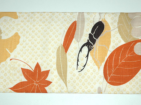紅葉に銀杏、葡萄、南天の葉に冬ごもりに向かうクワガタ(?)でしょうか、秋の柄がいっぱい。