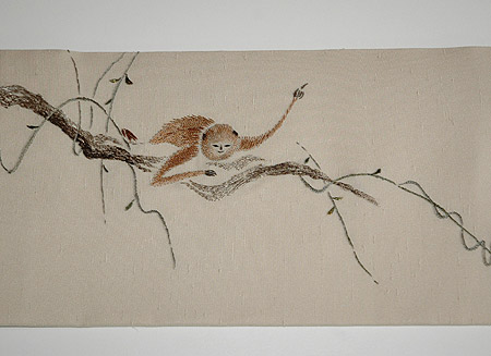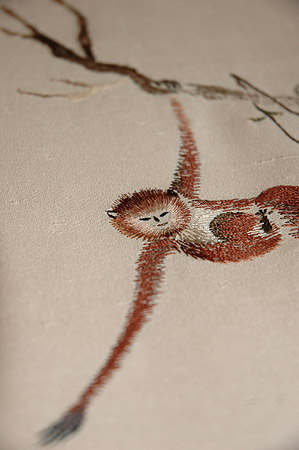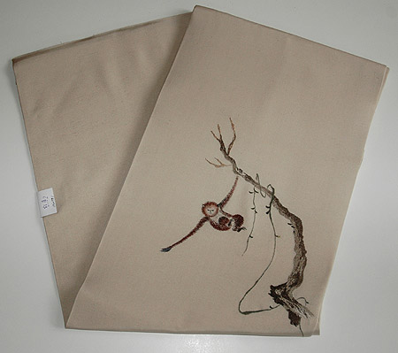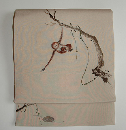 水辺にうつる月影を取ろうと手を伸ばしているところがかわいらしい帯です。