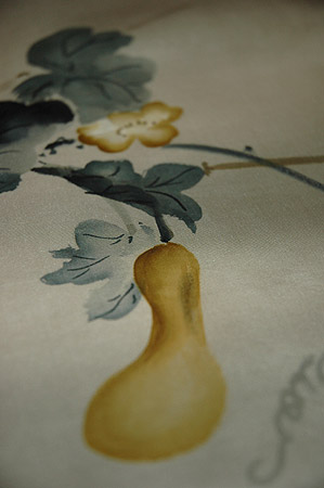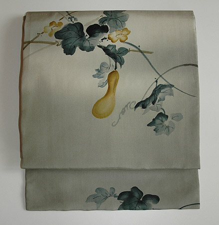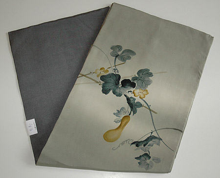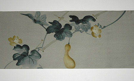 藍鼠色の塩瀬地が空に見え、同じトーンの濃い葉っぱが空の色を映して揺れているような愛らしい糸瓜の素描きです。