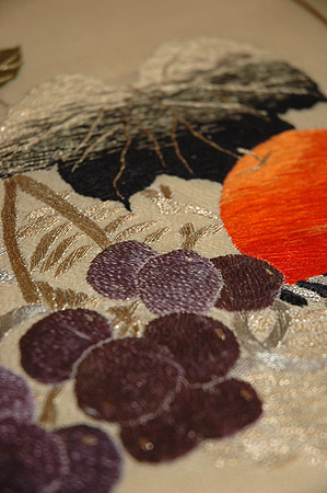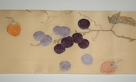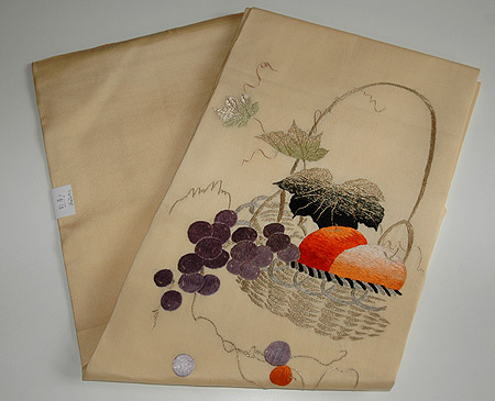 クリーム色の地に明るい色の林檎、葡萄、いちごのぬいきり刺繍が可愛らしい名古屋帯です。いちごのつぶや林檎の濃淡など細部の刺繍もみのがせません。