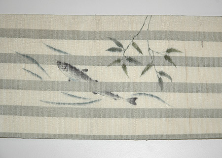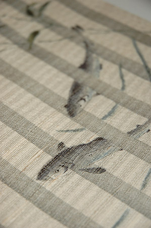 単衣の紬地に素描きの鮎が季節を待っていたようにいきいきと泳いでいます。