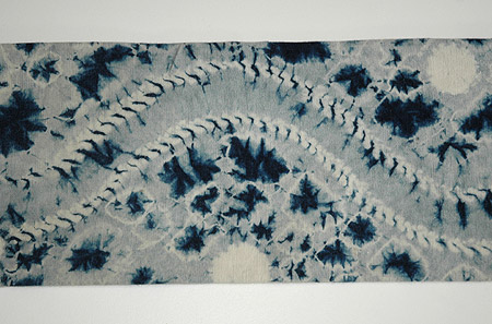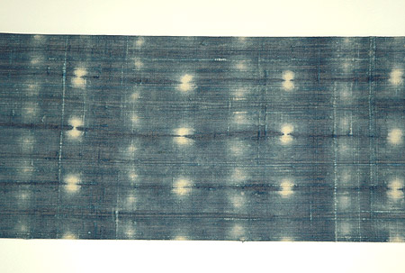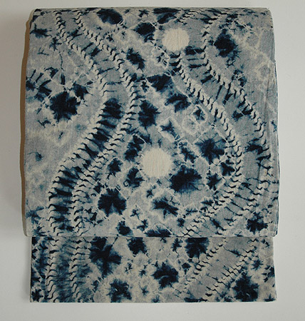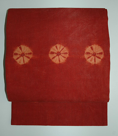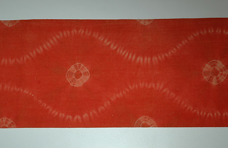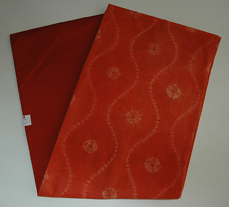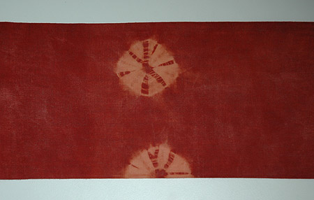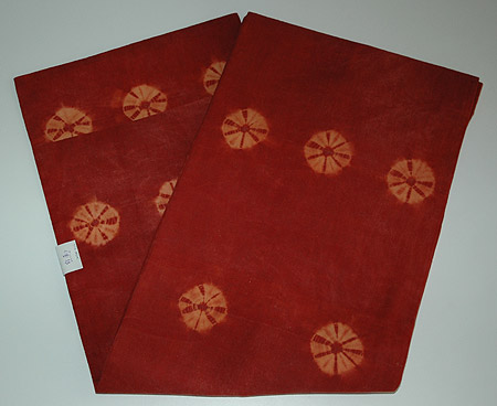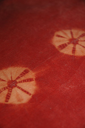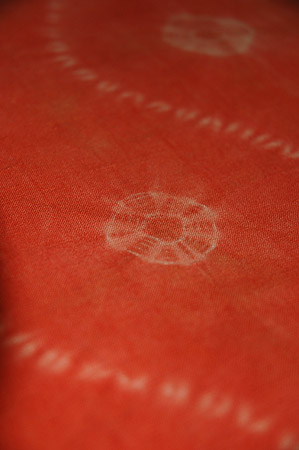 赤みの強い茜染めの地に、直径5~6cmほどの絞りの模様が施されています。