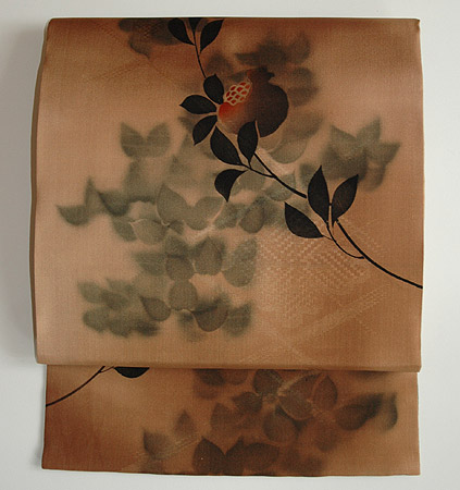 チョコレート、ベェージュ、墨色のシックな色合いが、大人のやさしさを感じさせるレトロモダンな帯です。