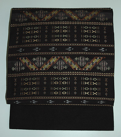 野原織物工房の名古屋帯です。しっとりとした黒の紬地に複雑な模様が熟練の技により手織りされています。