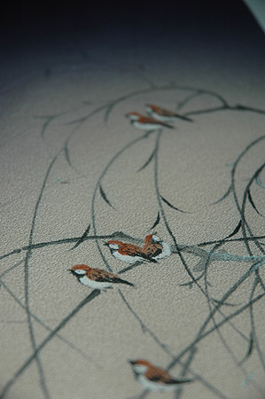 夕暮れ時、雀たちが群れをなし、四方を向いて鳴いている光景が目の前に広がりそうな帯です。