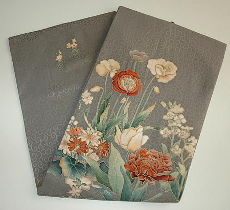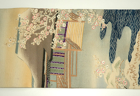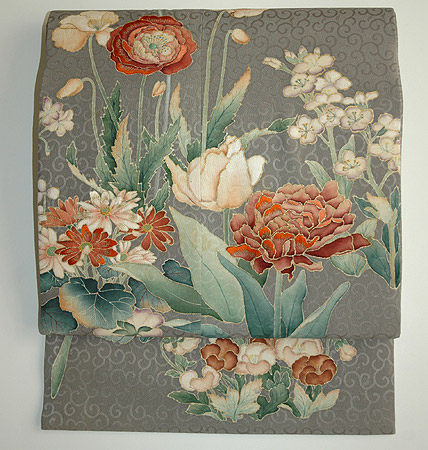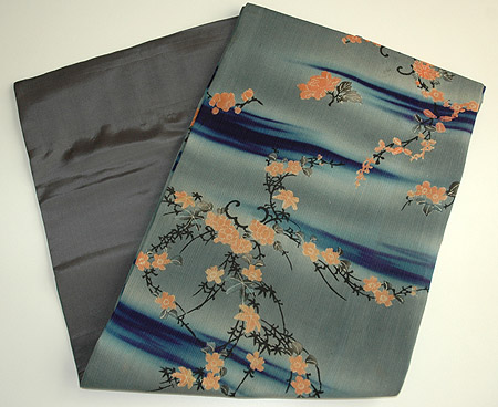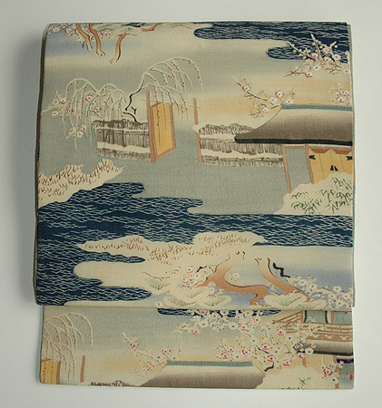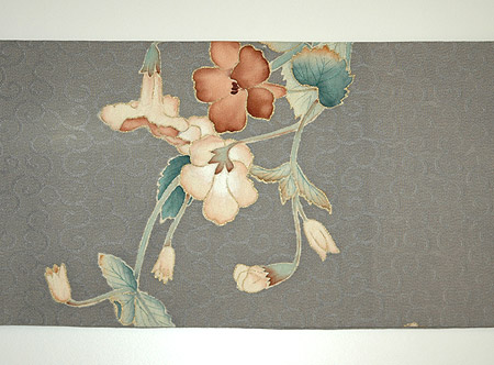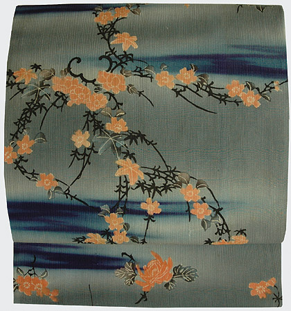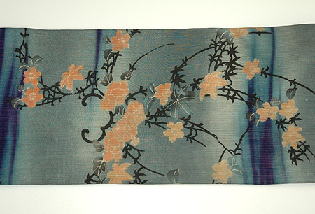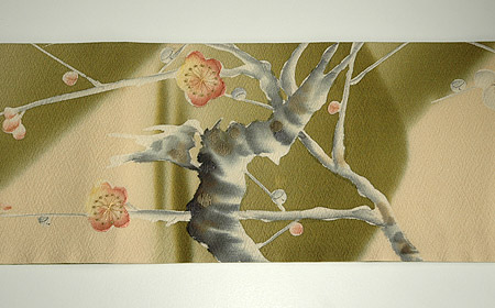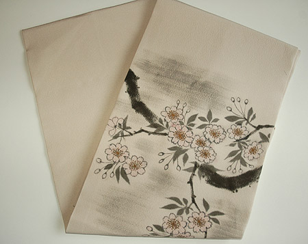 縮緬地に霞に咲く枝花が描かれた帯です。