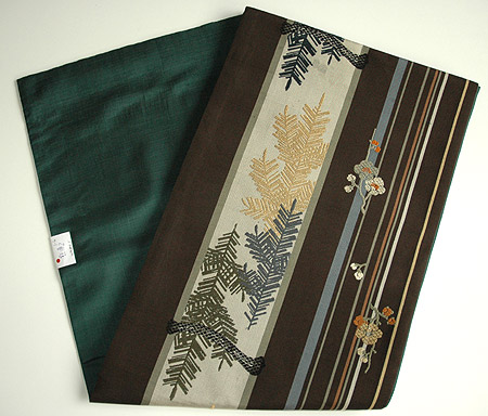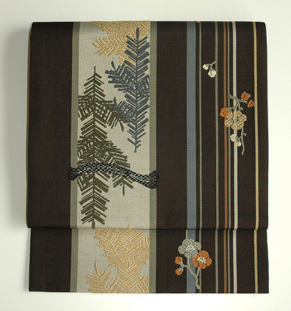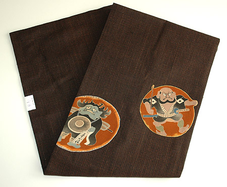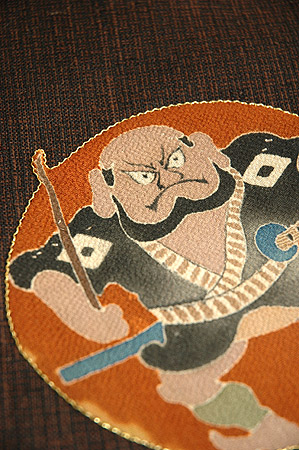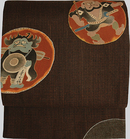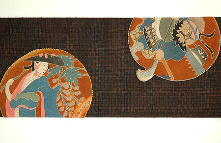焦げ茶色の紬に、縮の大津絵をアップリケして名古屋帯に仕立てました。