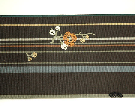 遠山に槍梅文様が描かれたやさしい色合いの名古屋帯です。