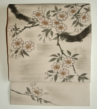墨色と薄色が、かすみを思わせる桜の花とつぼみが可愛らしい名古屋帯です。