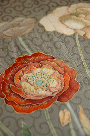 唐草紋の綸子地に春の花々が染めで描かれています。