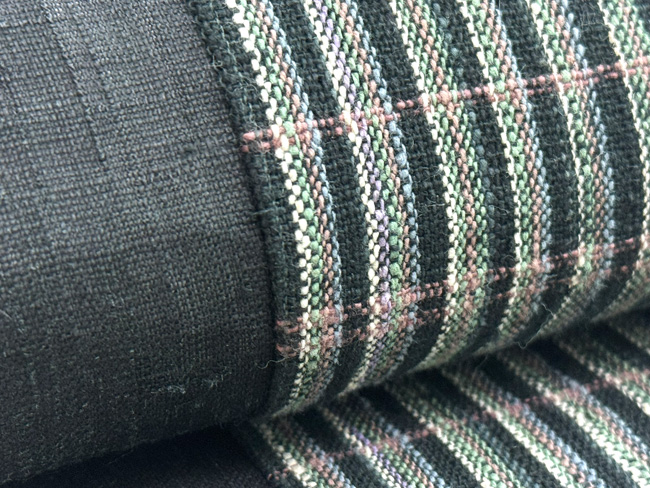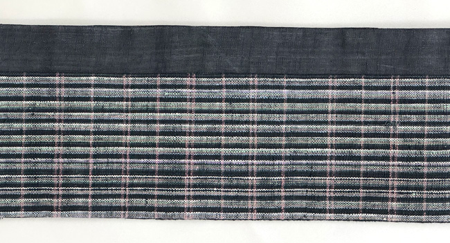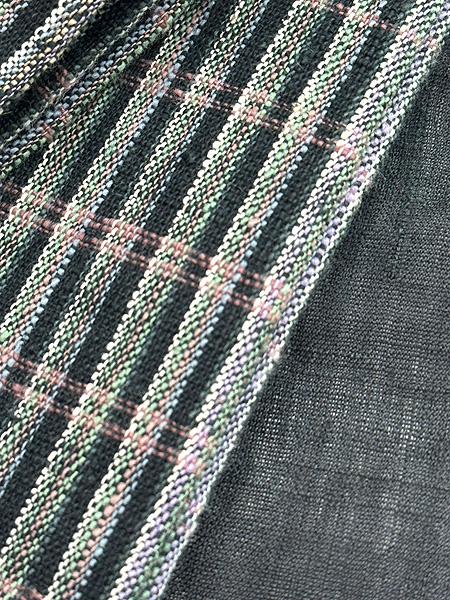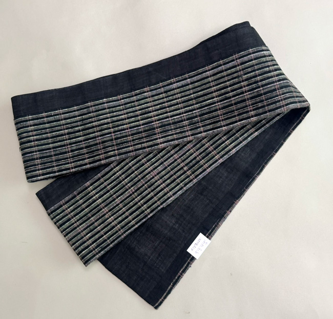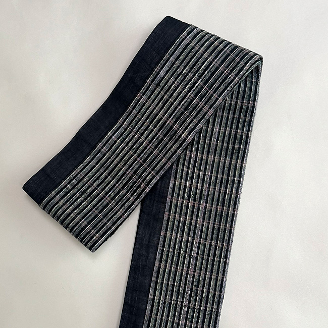 渋い麻の縞に墨色のボーダーがおしゃれにマッチした半幅帯です。