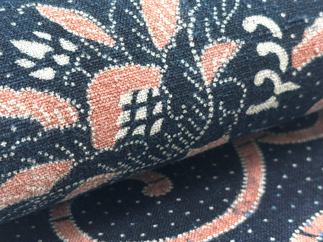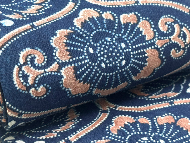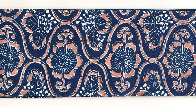 ちょっとエキゾチックな文様と、ベンガラのかわいい色とのハーモニーが楽しい半幅帯です。