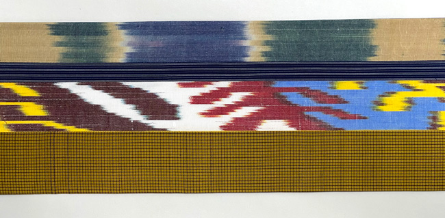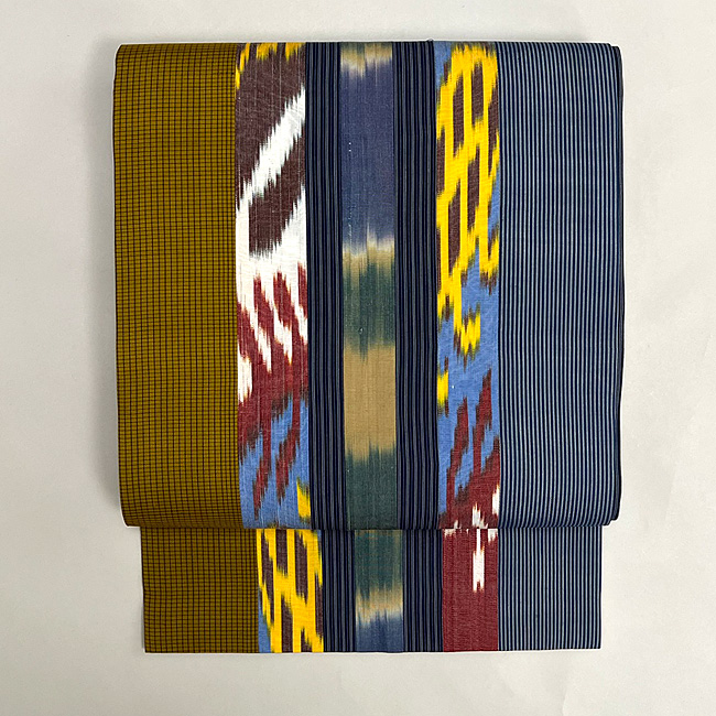 生まれも育ちも違う3種の布を継ぎ合わせたら、こんなに異色の帯ができました。