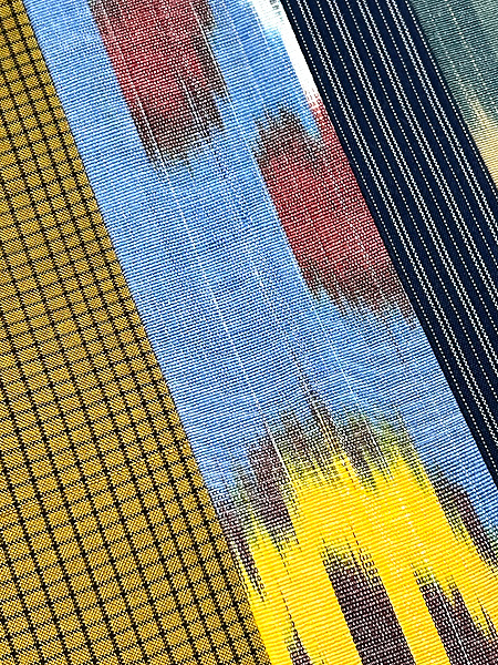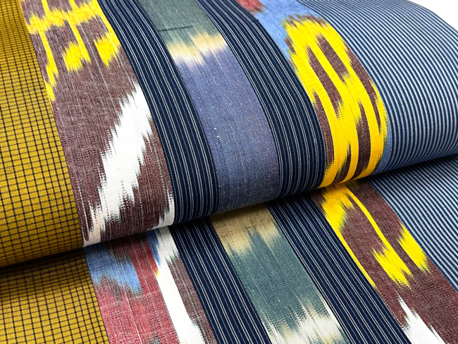 大胆柄のアドラスに、小さなドットの大島、思い切り黄色な黄八丈。