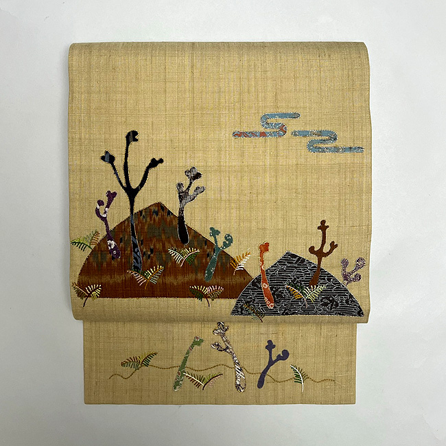 黄八丈と和更紗とで構成された、春を呼ぶ名古屋帯です。