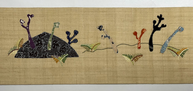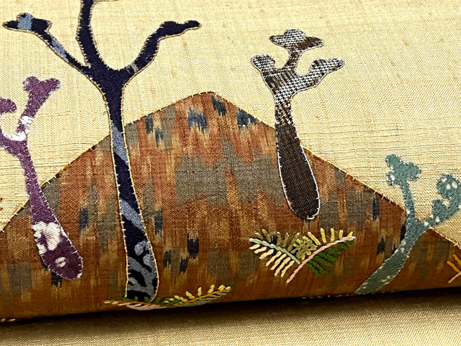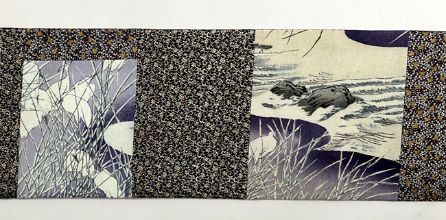 実は、このデザインソースは、桃山期の蒔絵から頂きましたが、布芸術?も美しいと思いませんか。