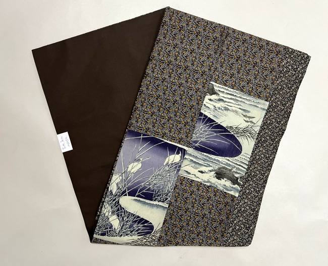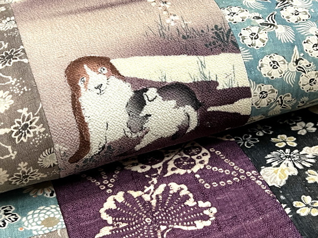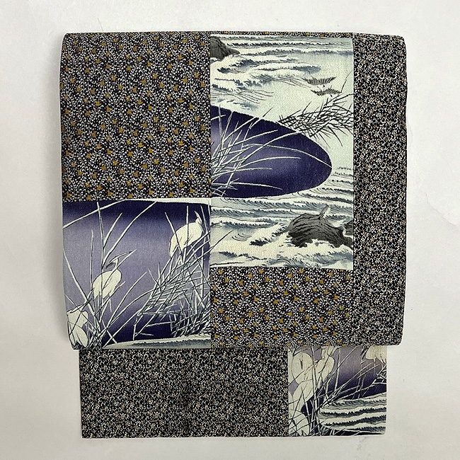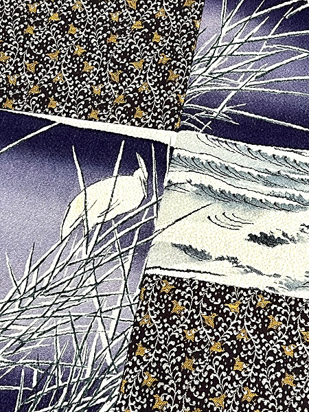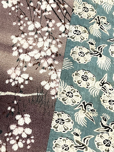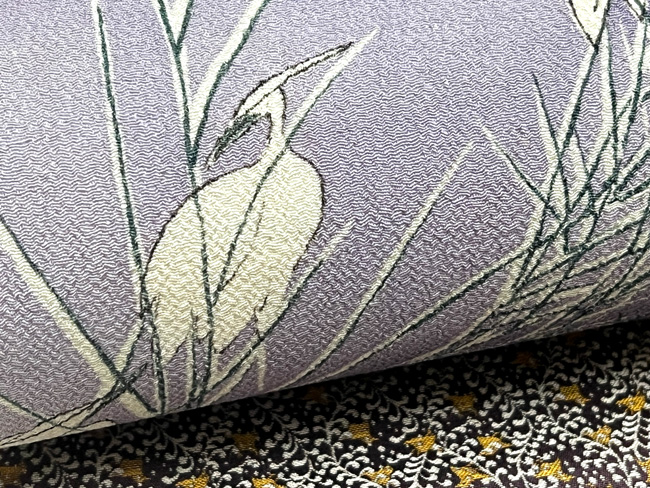 葦辺に鶴の舞う江戸縮緬を主役に、周りを渋い明治期の丸帯地で抑えてみました。