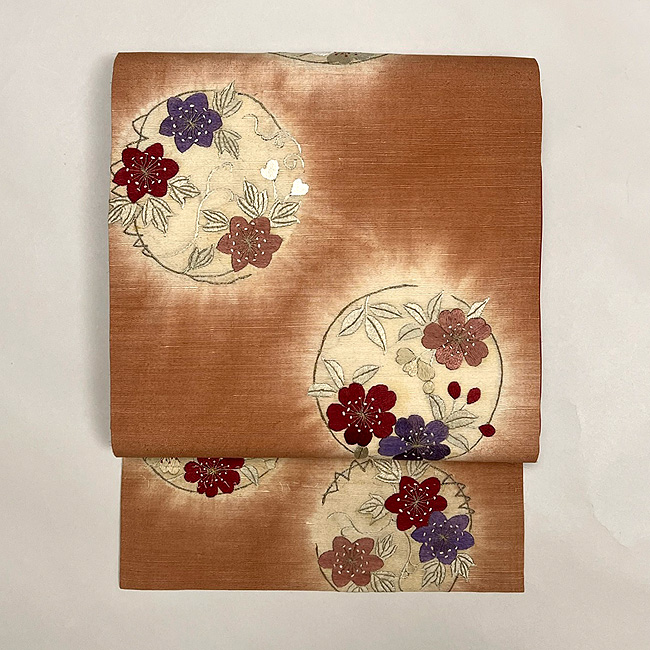 その花丸紋が、ほっこりと白いぼかしの中に浮かんでいる所に愛苦しさのある帯です。