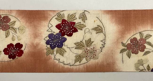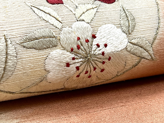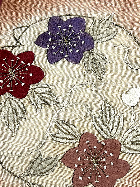 水がきという明るい灰赤の地色に沿った、上品で落ち着きのある色味に集約された花たちが優しく刺繍されています。