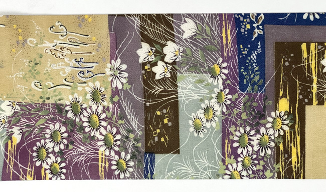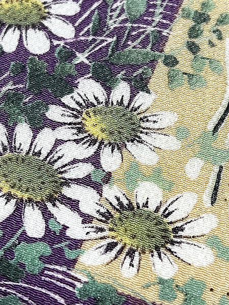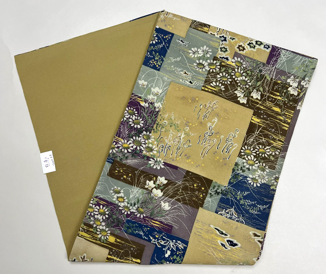 色紙に四季の花が盛り込まれた、楽しい文様の明治期の縮緬です。