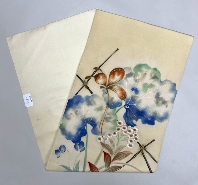 白綸子地に、有職文と四季の花文とが交互に交わった裂は、江戸後期武家女性の打掛のひとひらです。